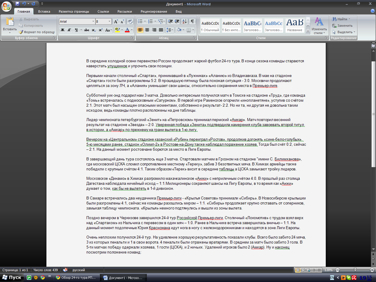 Очень неплохим получился 24-й тур. На удивление хорошую результативность показали клубы. Всего было забито 24 мяча, 3 из которых пенальти и 1 в свои ворота. 4 пенальти были отражены вратарями. В среднем за матч было забито 3 гола. В 5-ти матчах победу одержали хозяева, 1 гости (ЦСКА), и 2 ничьих. Удалений игроков было 2 (Амкар). Ну и наконец посмотрим положение команд: